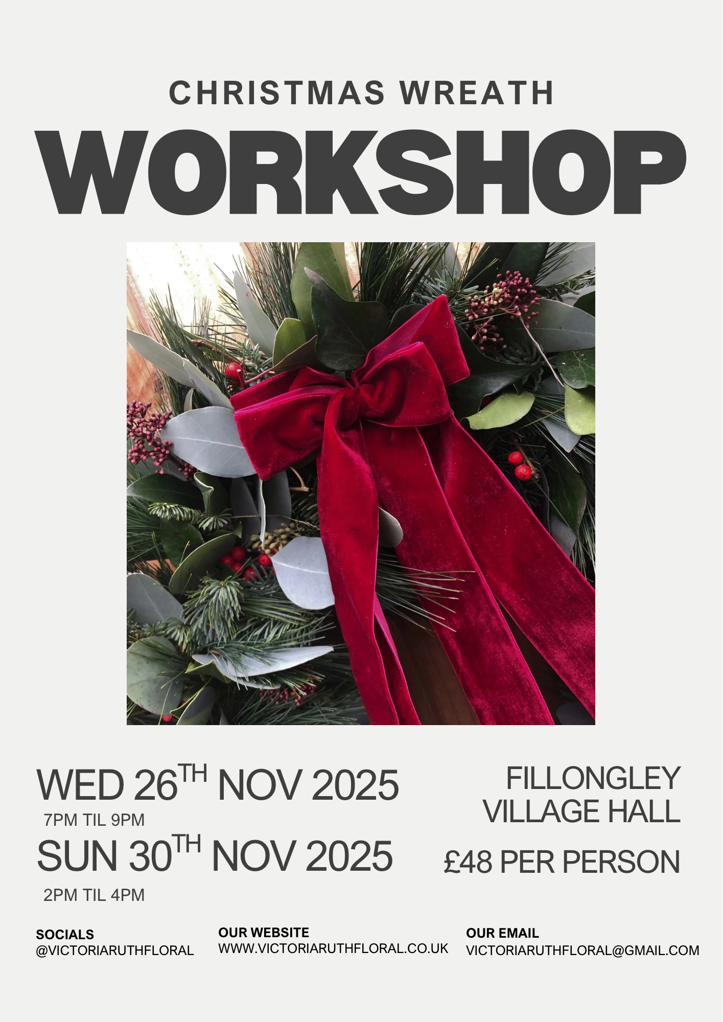 Please complete this booking form in order to book a place on our Christmas Wreath Workshop at Fillongley Village Hall on the 26th November 2025 or 30th November 2025. Please note that both the booking form and payment need to be completed in order to secure your place onto the workshop. Please contact us if you have any queries. We can't wait to see you there!